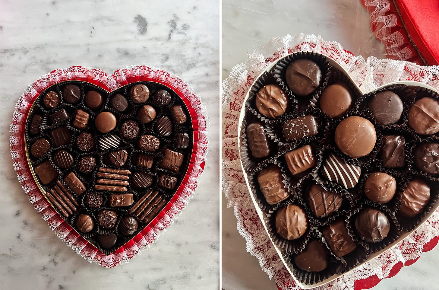 In January, I started sourcing vintage lace-trimmed chocolate heart boxes on eBay. My one requirement: ruffles along the edges. After securing three, I brought them to See’s Candies on the first of the month.