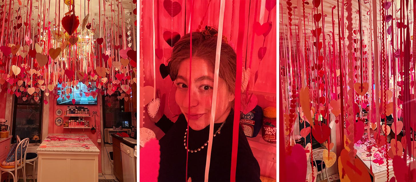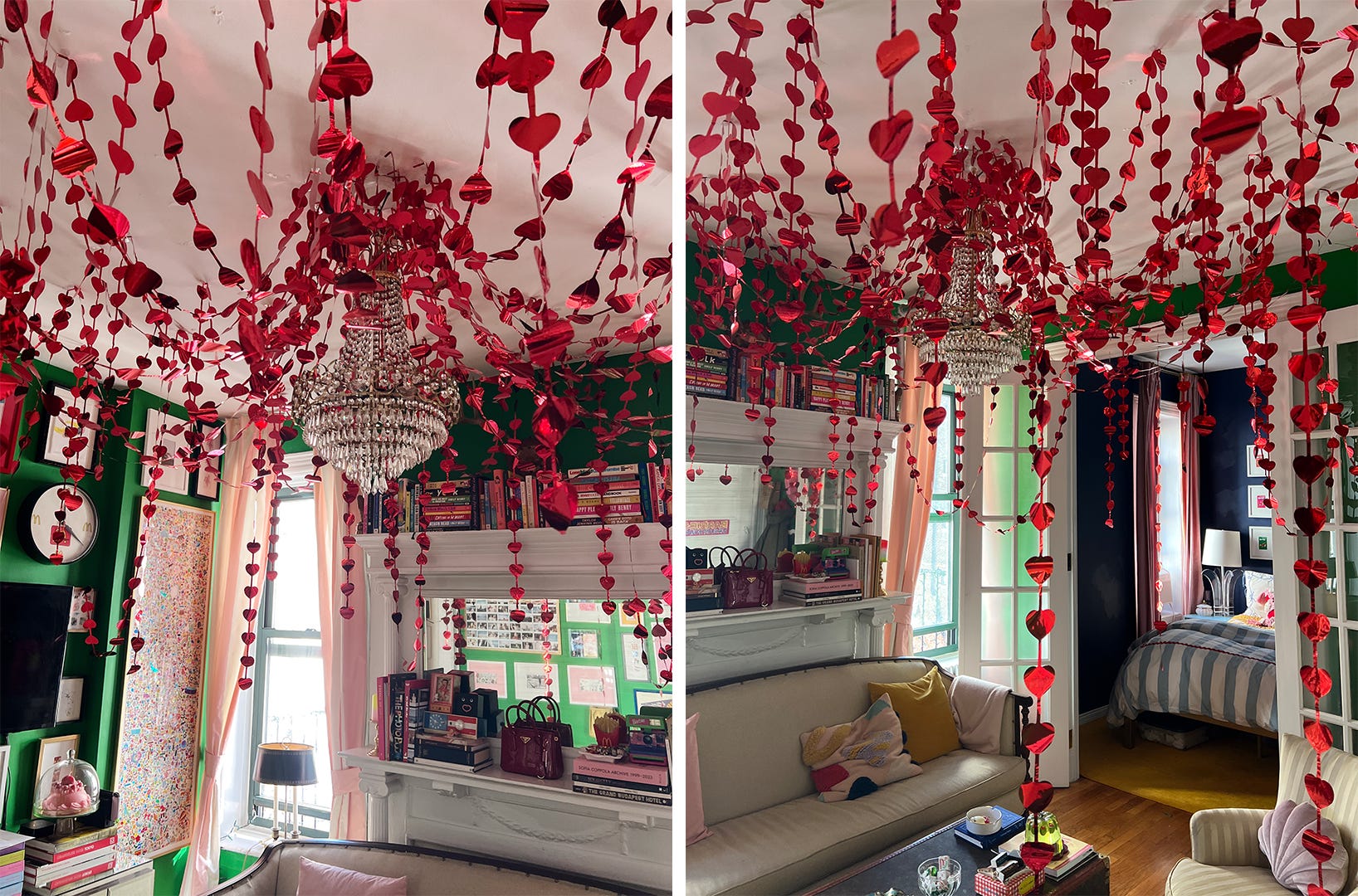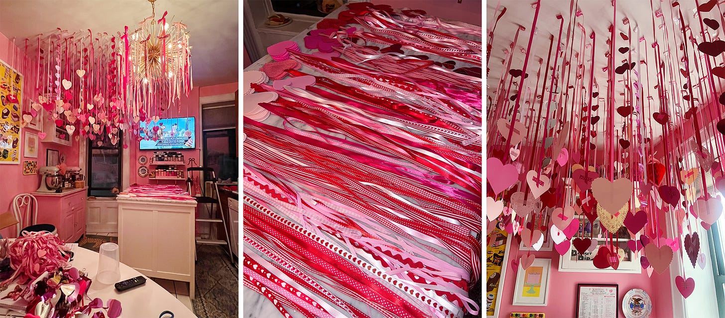 I decided the kitchen would be the only paper heart room. I realized I had all these extra mylar hearts (the amount i had of those was correct), so, I draped about 50 heart garlands across the living room ceiling, creating what I started calling the “heart fountain.” During a marathon of Annie Hall, Manhattan, and Interiors, it all came together.