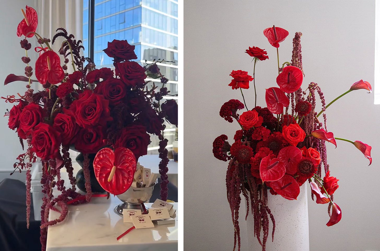 I reached out to Maka Flora in early January to secure the date before the Valentine’s rush. I sent over inspiration and outlined exactly what I wanted: two sculptural arrangements using only red flowers–one for the kitchen and one for the living room.